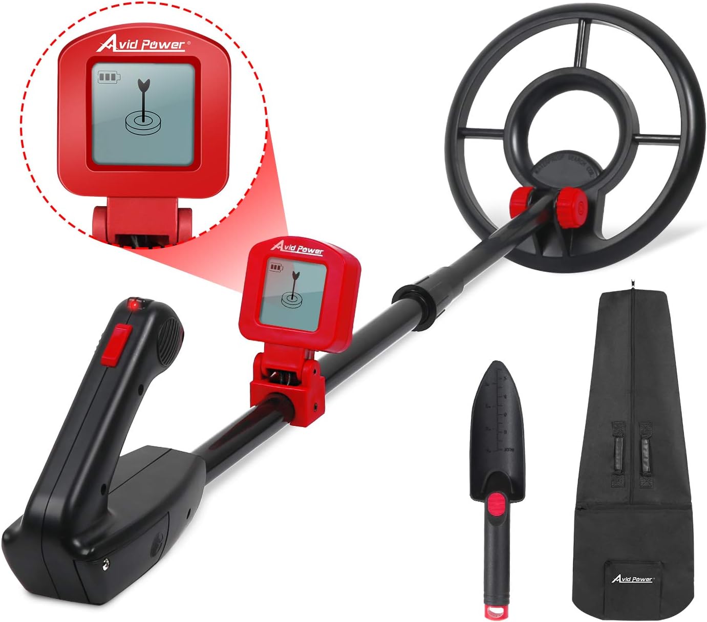 Lcd display—shows the probable type of metal with an arrow, the depth of the target, disc range.