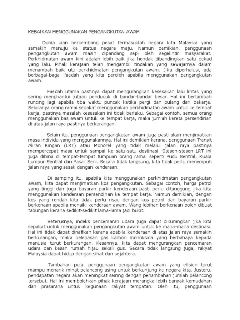 Karangan Spm Pengangkutan Awam / Para pedagang senjata menjadikan nyawa manusia sebagai taruhan untuk mengaut keuntungan tinggi ekoran perkembangan industri senjata dunia.. Secara tamsilnya, perjalanan dari kuala lumpur ke penang dengan memandu kereta mengambil masa lebih kurang 6 jam. Kerajaan juga telah mengadakan pelbagai langkah untuk menggalakkan orang ramai supaya menggunakan pengangkutan awam bagi mengatasi masalah kesesakan khususnya di kawasan bandar. Masalah pengangkutan awam di negara kita langkah menggalakkan orang ramai menaiki pengangkutan awam. Apakah sumbangan pengangkutan awam dan masalah yang dihadapi dalam sektor pengangkutan awam? Pengangkutan awam termasuk bas awam, feri, kereta api, transit aliran ringan (lrt) turut dibenarkan beroperasi dengan kapasiti.