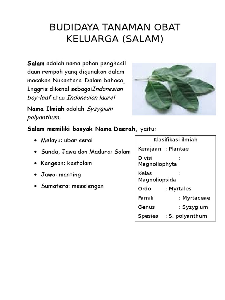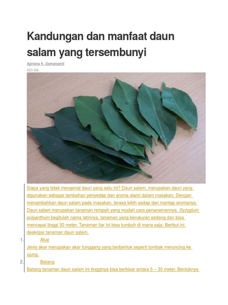 DAUN SALAM SEBAGAI ANTIDIABETES PDF from 4.bp.blogspot.com Manfaat daun salam untuk darah tinggi juga bisa kamu rasakan. Pohon salam memiliki nama latin syzygium. Daun salam laurier indonesien daun salam daun salam. Daun salam in a sentence and translation of daun salam in english dictionary with audio pronunciation by dictionarist.com. Daun tunggal terletak berhadapan, dengan tangkai hingga 12 mm. Need to translate daun salam from indonesian? Daun salam mempunyai kandungan senyawa seperti niasin, serat, tannin, dan… The indonesian folk name daun salam literally means peace leaf, but i cannot explain this name further.